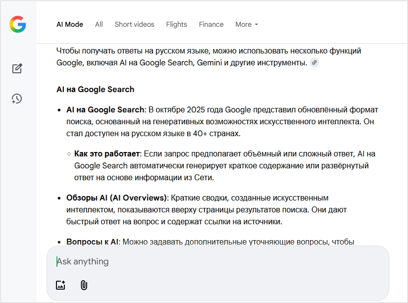 Google расширил доступ к продвинутому поиску на базе ИИ на Беларусь и добавили поддержку русского языка. Режим ИИ-поиска позволяет задавать сложные вопросы и получать развёрнутые ответы на них со ссылками в формате диалога. У него улучшенная по сравнению с ИИ-обзорами система рассуждения и новые способы взаимодействия с запросами. ИИ разбивает их на подтемы и ищет информацию по каждой одновременно, чтобы давать наиболее релевантные ответы. Также у него есть агентные возможности — можно, например, забронировать столик в ресторане.