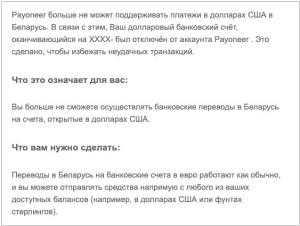 Payoneer стал рассылать белорусским пользователям уведомления о том, что «чтобы избежать неудачных транзакций», долларовые банковские счета беларусов отключают от аккаунтов Payoneer. Переводы в Беларусь на счета, открытые в долларах, этим пользователям Payoneer больше не доступны. Но счета в евро работают штатно. Представители сервиса уточнили, что на них можно отправлять средства «напрямую с любых доступных балансов, например, в долларах США или фунтах стерлингов». Будет происходить автоматическая конвертация валют. С февраля 2022 года с Payoneer работают не все беларусские банки. Клиенты тех, кто попал под санкции, выводить деньги не могут. Также у беларусов есть сложности с созданием новых аккаунтов в сервисе.