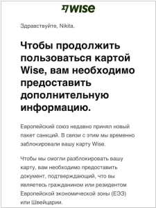 Платежный сервис Wise тоже отключает аккаунты российский и белорусских пользователей. Все они получили письмо счастья со следующим содержанием: "с 10 марта Вы больше не сможете получать EUR, вы сможете только выводить деньги со своего счета, мы закроем Ваш профиль Wise через 60 дней. Почему это происходит? Последствия действующих санкций и событий последних дней значительно усложнили нашу работу в России и Беларуси, что может привести к тому, что пользоваться нашими услугами или вывести деньги со счета будет для Вас все труднее или вовсе невозможно.