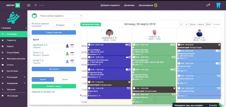 Онлайн программа для стоматологов. Карта пациента, все нюансы лечения пациента, детализированная зубная формула, удобный календарь записи, массовая рассылка уведомлений клиники, учет и заказ расходников, встроенный бухгалтер и много других полезных функций.