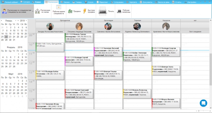Система автоматизации и управления стоматологической клиникой, стоматологическим кабинетом. В программе есть электронное расписание, картотека пациентов, план лечения, зубные карты, учет препаратов, программы лояльности, sms и email - рассылки, модуль расчета зарплат, модуль онлайн-записи на прием, отчеты в режиме реального времени, интеграция с ip-телефонией и торговым оборудованием и многое другое.